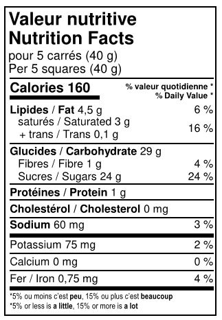 Sugars (sugar, white fondant (sugar, glucose, water), glucose), Dark chocolate (sugar, unsweetened chocolate, cocoa butter, soy lecithin, vanilla essence), Coconut, water, Salt, Natural vanilla essence.