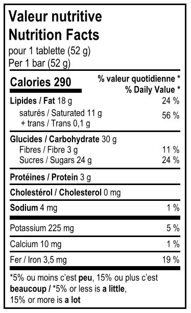 Sugar, Unsweetened chocolate, Cocoa butter, Soy lecithin, Vanilla essence.