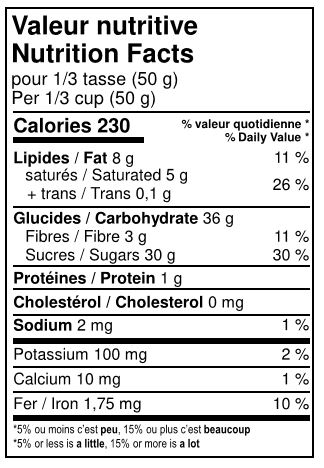 Cranberries (dried cranberries, sugar, sunflower oil), Dark chocolate (sugar, unsweetened chocolate, cocoa butter, soy lecithin, vanilla essence).