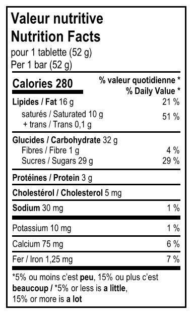 Sucre, Beurre de cacao, Substances laitières, Chocolat non sucré, Lécithine de soya, Essence de vanille.