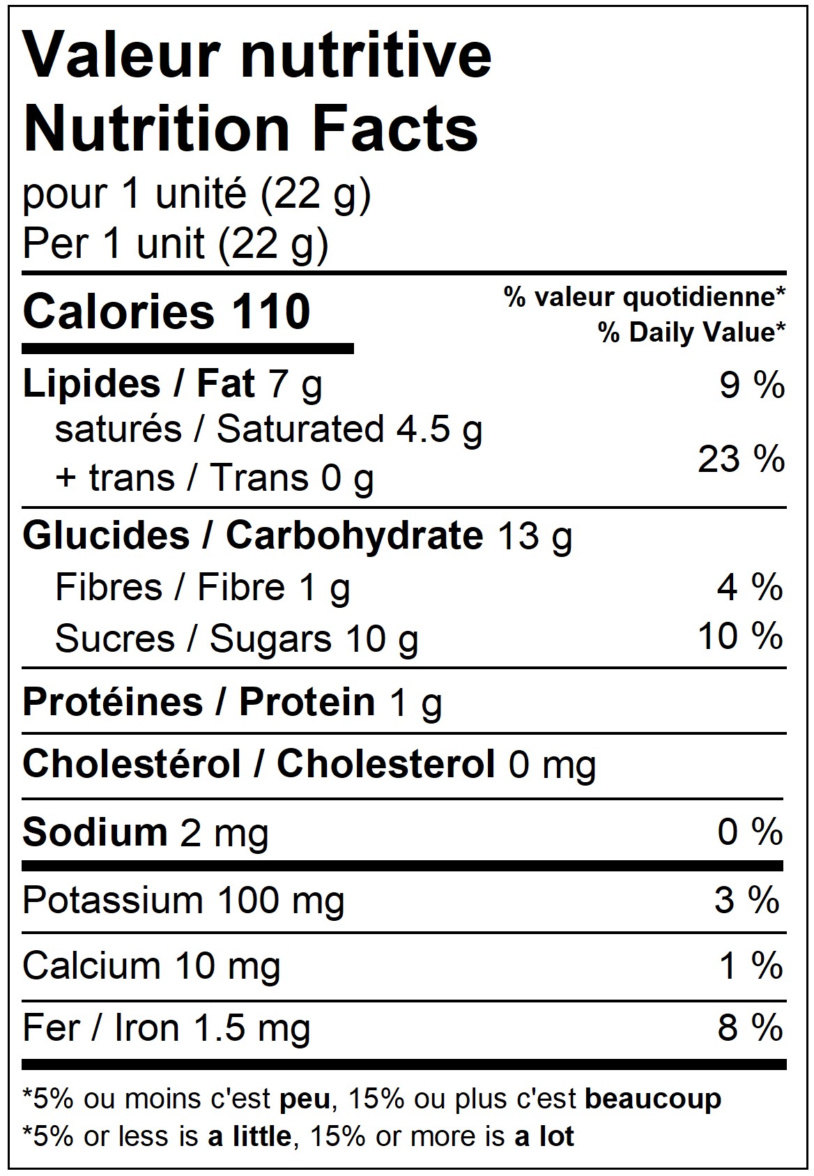 Sucre, Chocolat non sucré, Beurre de cacao, Lécithine de soya, Essence de vanille.