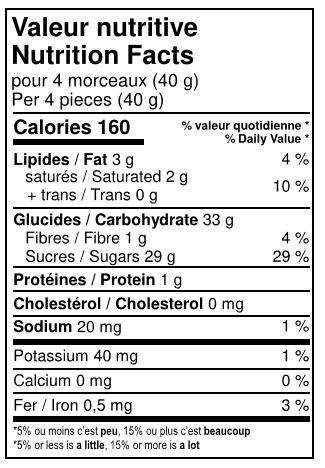 Sucres (sucre, fondant blanc (sucre, glucose, eau), glucose), Chocolat noir (sucre, chocolat non sucré, beurre de cacao, lécithine de soya, essence de vanille), Eau, Essence naturelle de fruits, Sel.