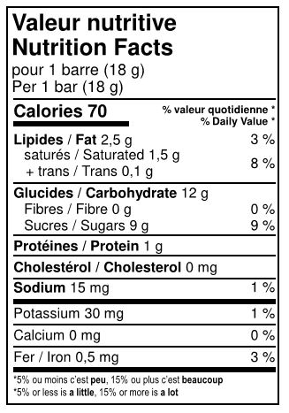 Sucres (glucose, sucre), Chocolat noir (sucre, chocolat non sucré, beurre de cacao, lécithine de soya, essence de vanille), Eau, Gélatine, Sel, Essence naturelle de vanille, Acide citrique, Bicarbonate de soude, Fécule de maïs.