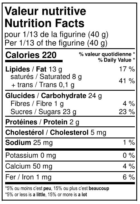 Sucre, Beurre de cacao, Substances laitières, Chocolat non sucré, Lécithine de soya, Essence de vanille.