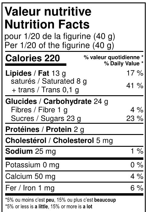 Sucre, Beurre de cacao, Substances laitières, Chocolat non sucré, Lécithine de soya, Essence de vanille.