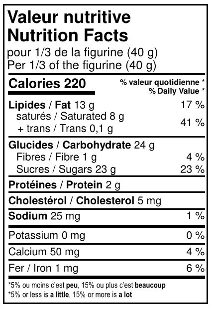 Sucre, Beurre de cacao, Substances laitières, Chocolat non sucré, Lécithine de soya, Essence de vanille.