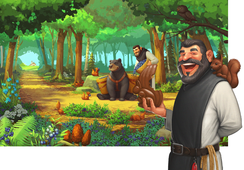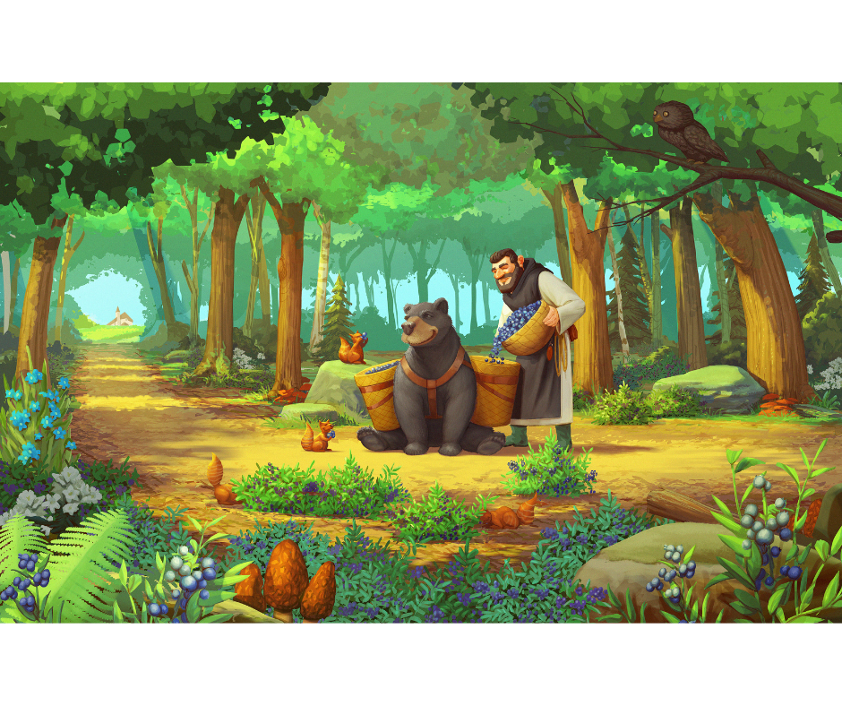 Cohabitant harmonieusement avec ses amis les ours, les oiseaux et les écureuils, le moine Cueilleur gambade tout en sachant que ses récoltes feront une différence à la fin de la journée.