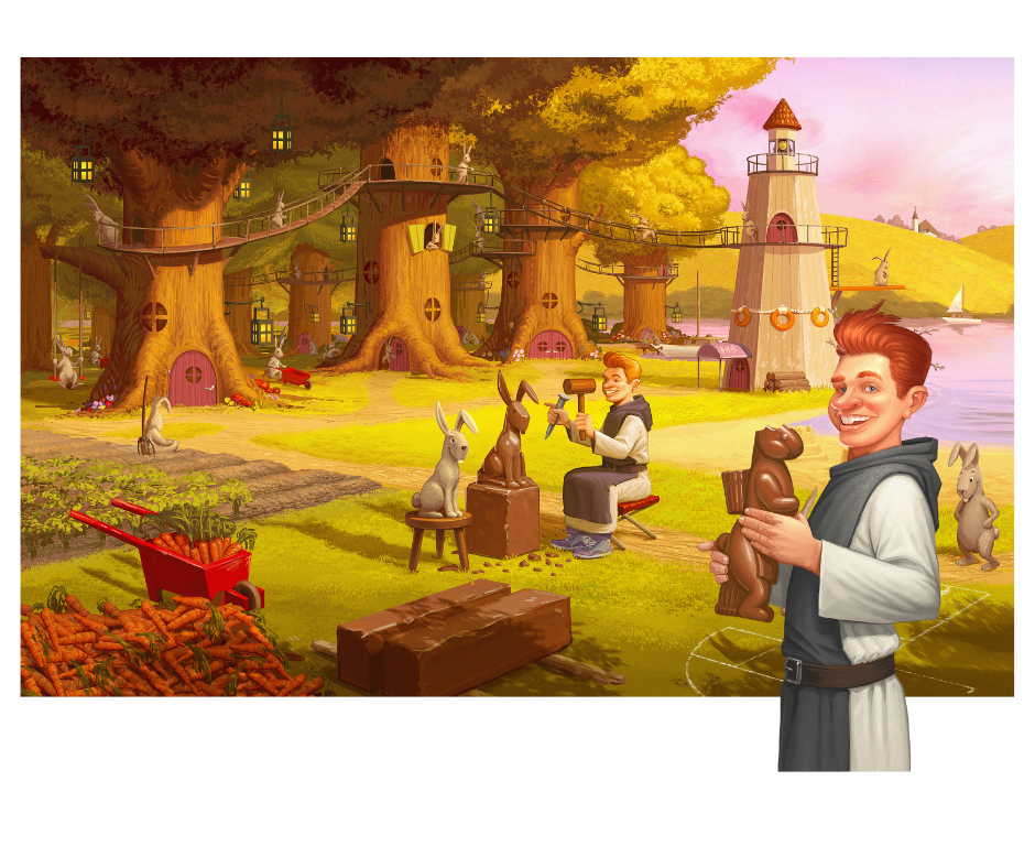 Le moine Malcommode met à profit ses talents manuels en leur construisant un clapier, un abri qui permet de les protéger. Il s’agit d’un habitat qui est constitué d’un espace de vie et d’une zone de repos, au grand bonheur des lapins. Sa passion a su inspirer les créations chocolatées de l’atelier du moine Savant.
