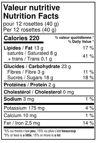 Sucre, Chocolat non sucré, Beurre de cacao, Lécithine de soya, Essence de vanille.